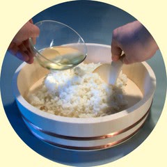 The rice is ready after 25 minutes altogether and should be mixed with the spiced vinegar immediately. Therefore fill the cooked rice into a flat wooden bowl. Add the prepared spiced vinegar and blend with a wooden spatula.